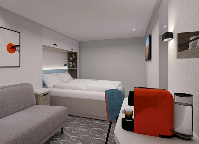 SUWO - Weitblick Suite 45 m² + balkón 12 m² s hojdacou sieťou. Oddelená spálňa a obývacia časť, šatník. 14. paluba. Max 4 osoby. Výhody Suite. 8 388 € 2 796 € za osobu